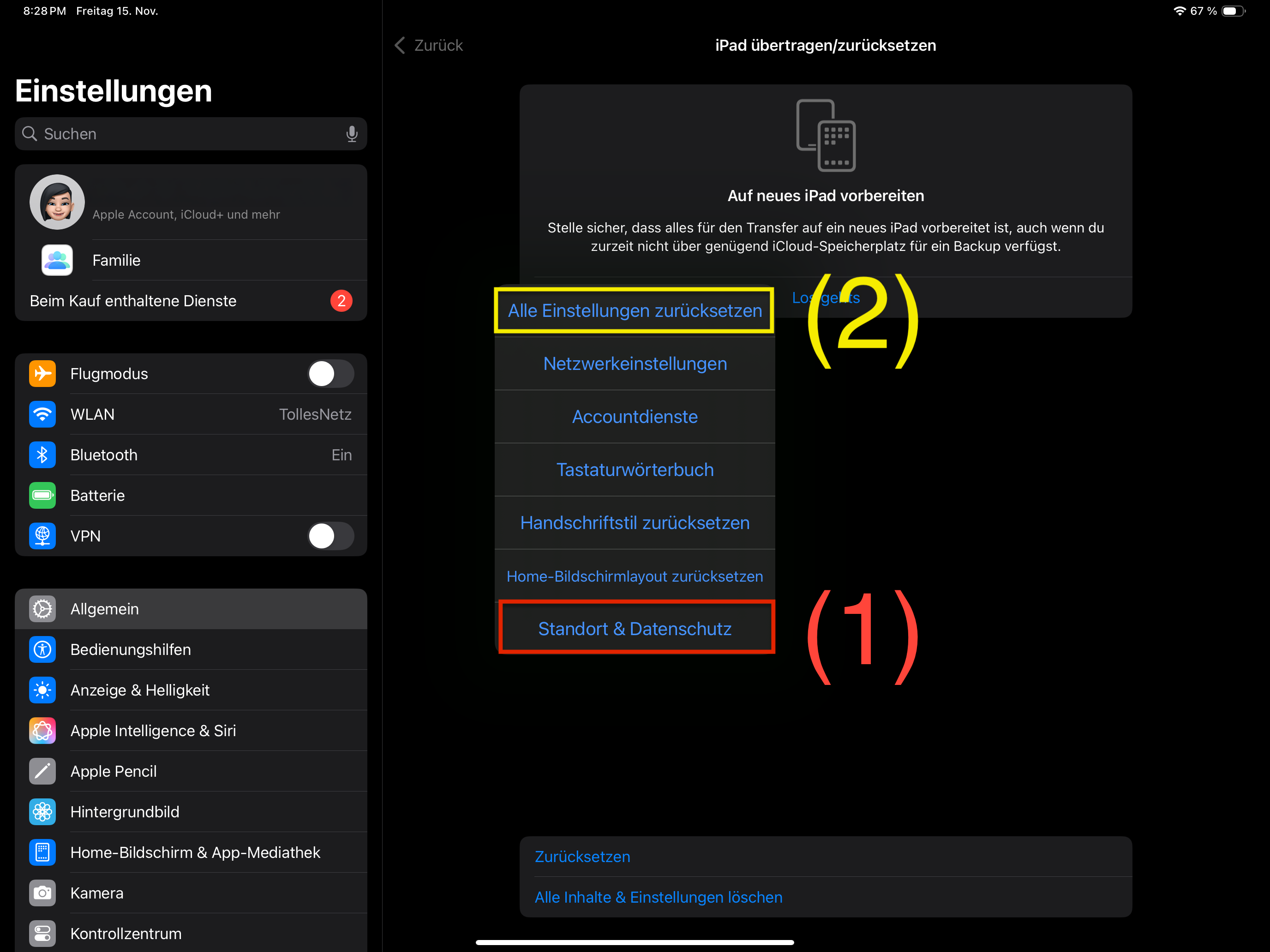 nur „Standort & Datenschutz“ (1) zurücksetzen musst. Auf jeden Fall musst du zunächst einmal diesen Punkt anklicken, dein Passwort/Code eingeben. Dabei werden u.a. die Standortfreigaben der Apps zurückgesetzt.